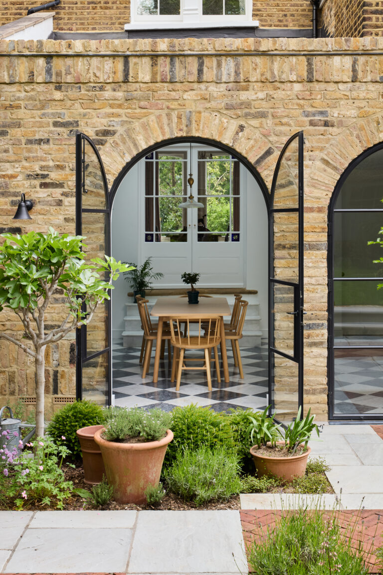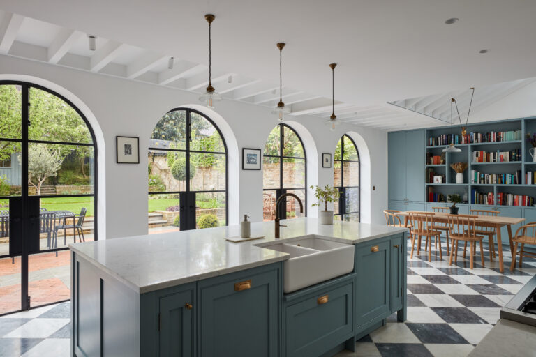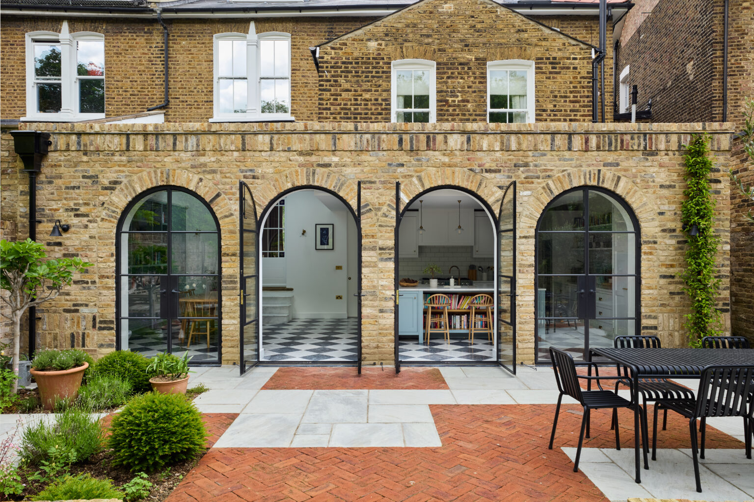 The brief was rooted in heritage and lifestyle: retain the historic charm of the original house, open the rear of the home to the garden, and create flowing, functional spaces for a growing family. With a strong passion for gardening, the clients sought to bring the outdoors in, both visually and physically. Delve’s architectural response was to design a striking yet sympathetic rear extension – a brick-clad pavilion that opens to the garden through a dramatic series of arches, seamlessly connected via bespoke Fabco steel doors and windows.