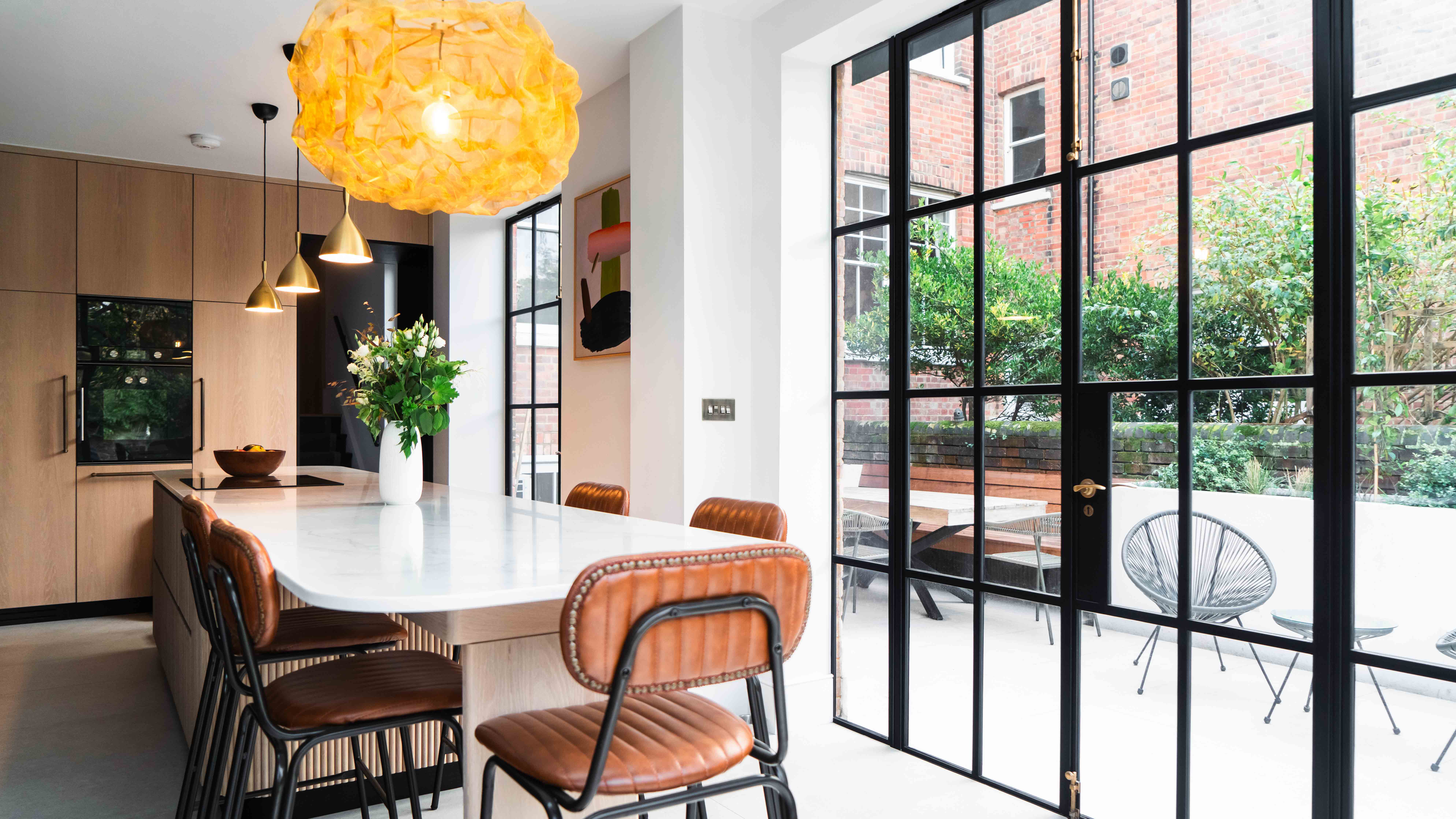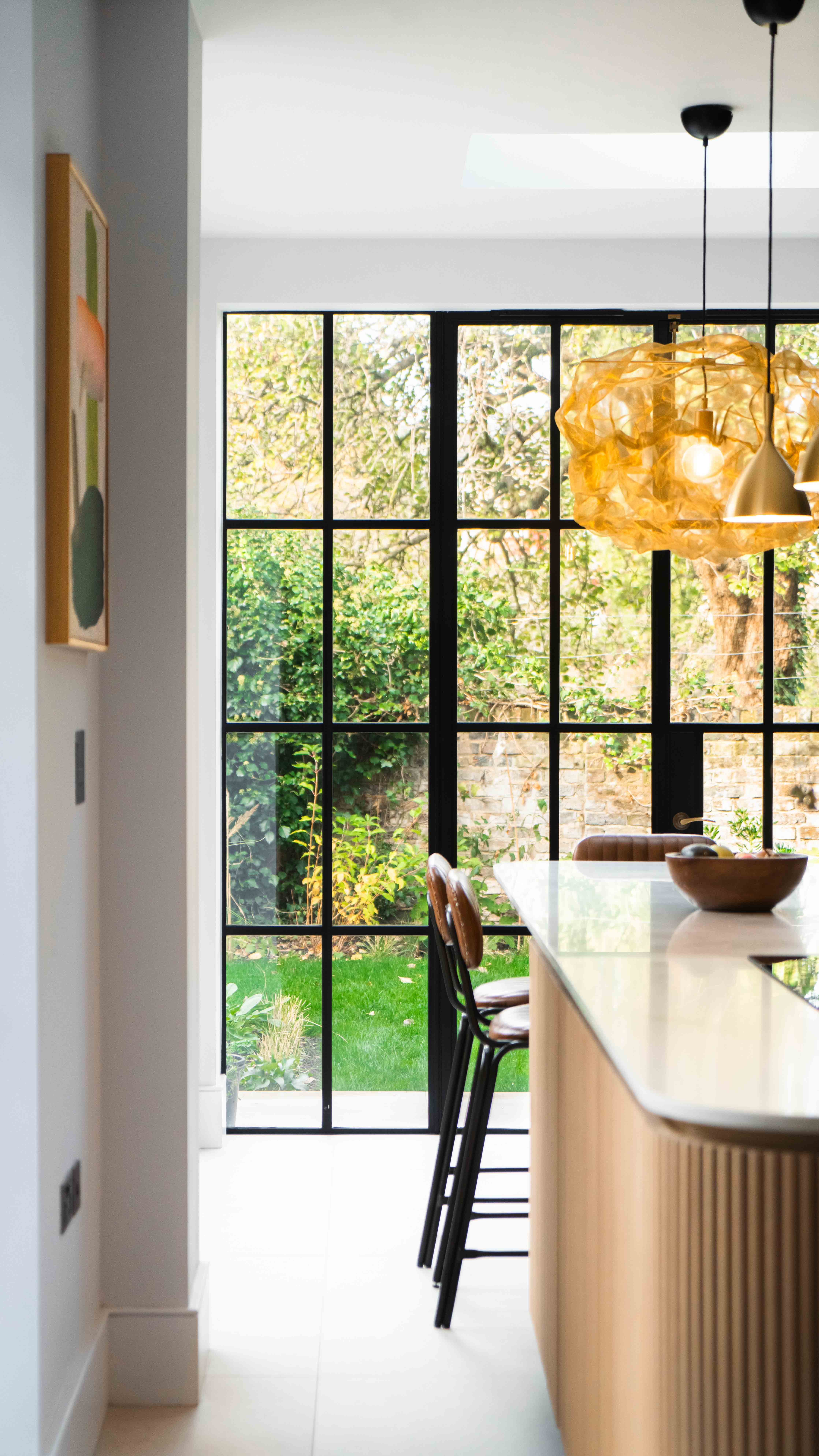 Extending the floor finish into the side garden further enhanced this connection, making the kitchen feel twice its size despite the garden’s modest dimensions. While the architect considered minimal sliding doors and bi-folding windows, they lacked the visual interest provided by the steel frames. In the UK, where windows are often closed due to the weather, it’s essential that they look as beautiful closed as they do open. The thicker frames of bi-fold doors didn’t align with the refined design we envisioned, so they opted for an alternative that maintained elegance and visual continuity, which was steel windows. The thin window bars, used and designed in collaboration with Fabco, were inspired by Japanese shoji screens, adding a subtle Japandi influence.