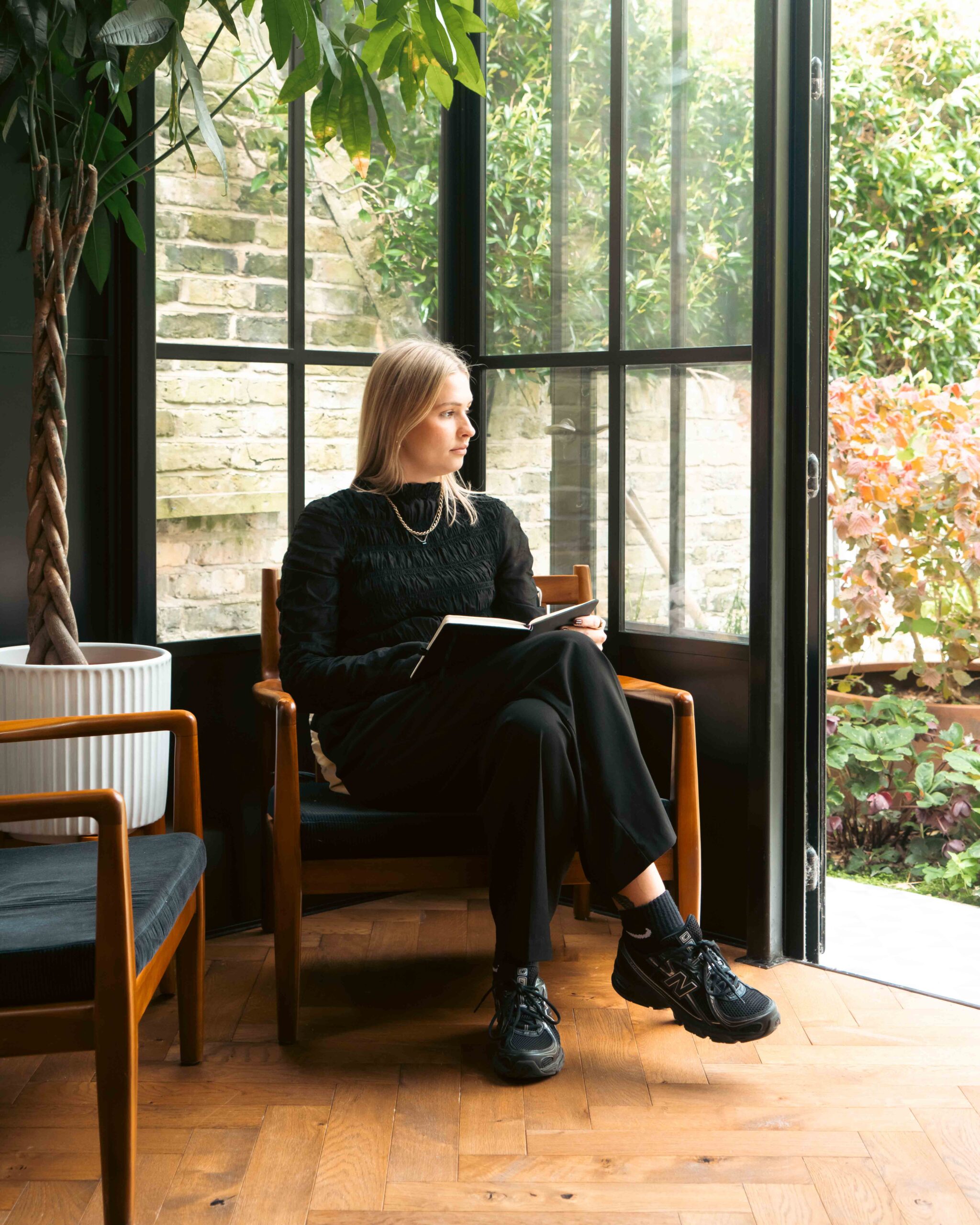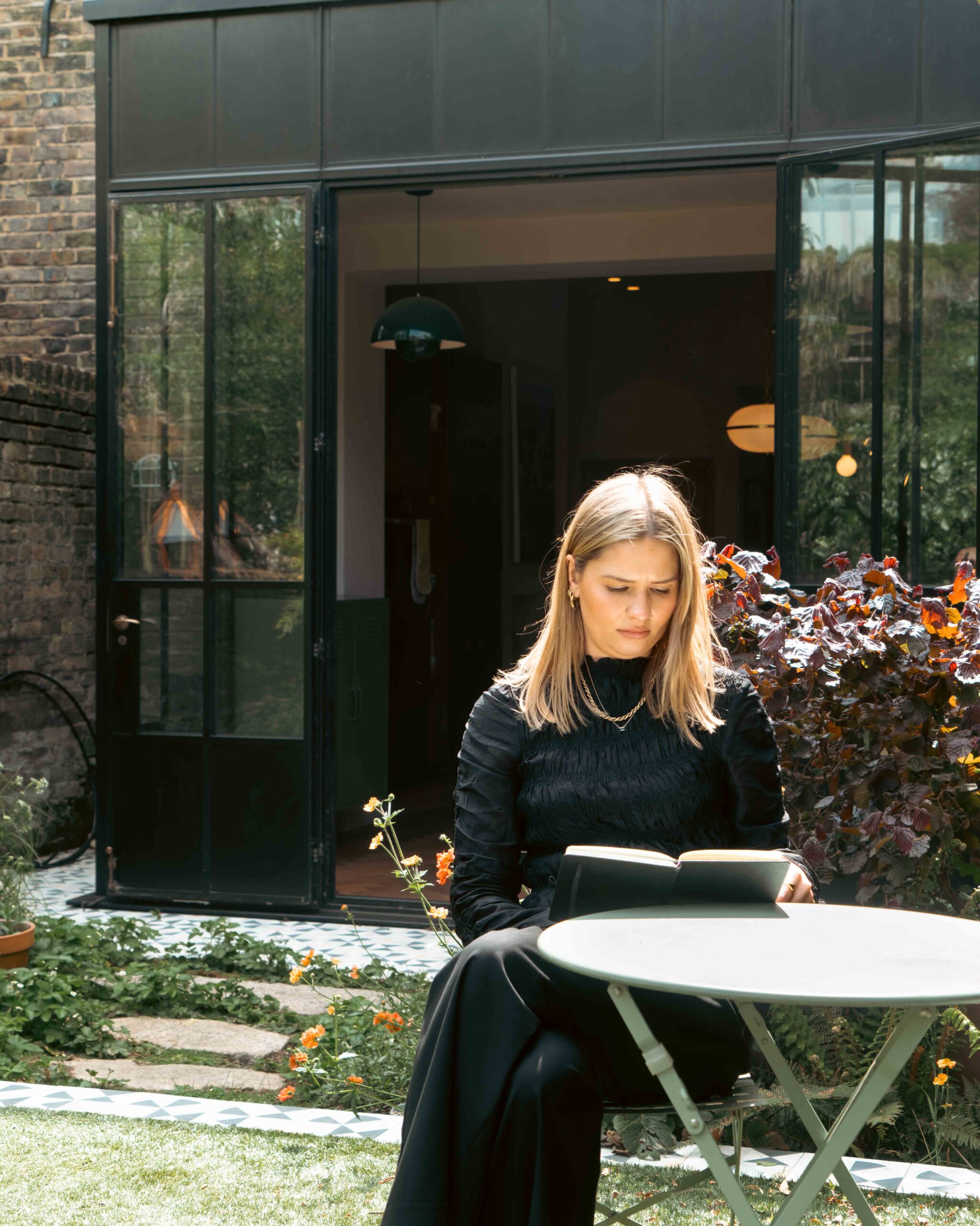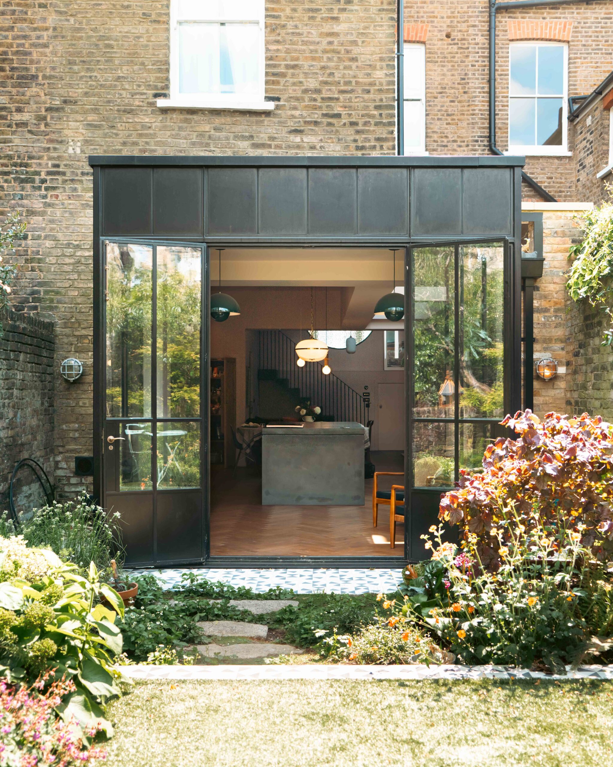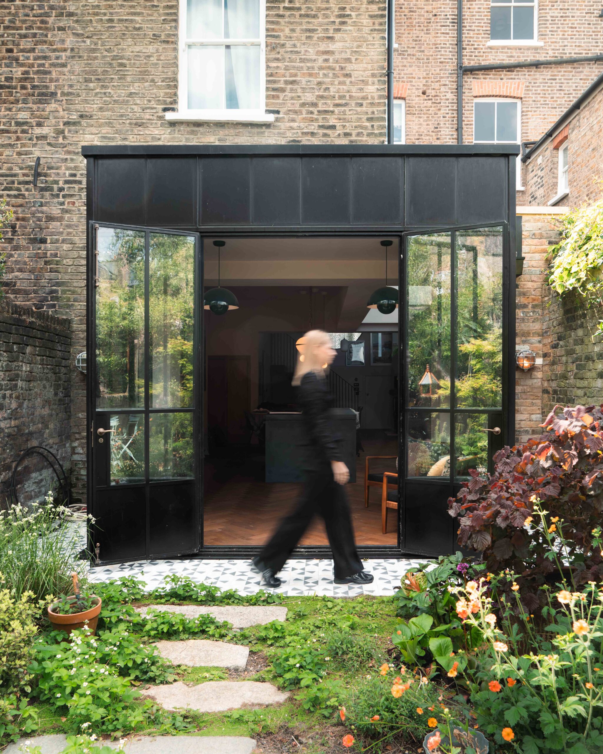 The black steel frames provided a crisp contrast to the pale London stock brick and added definition to the glazed pavilion, reinforcing the sense of architectural precision. In particular, the fine steel profiles of the garden room allowed the extension to feel both lightweight and immersive, blurring the boundary between the house and its garden.