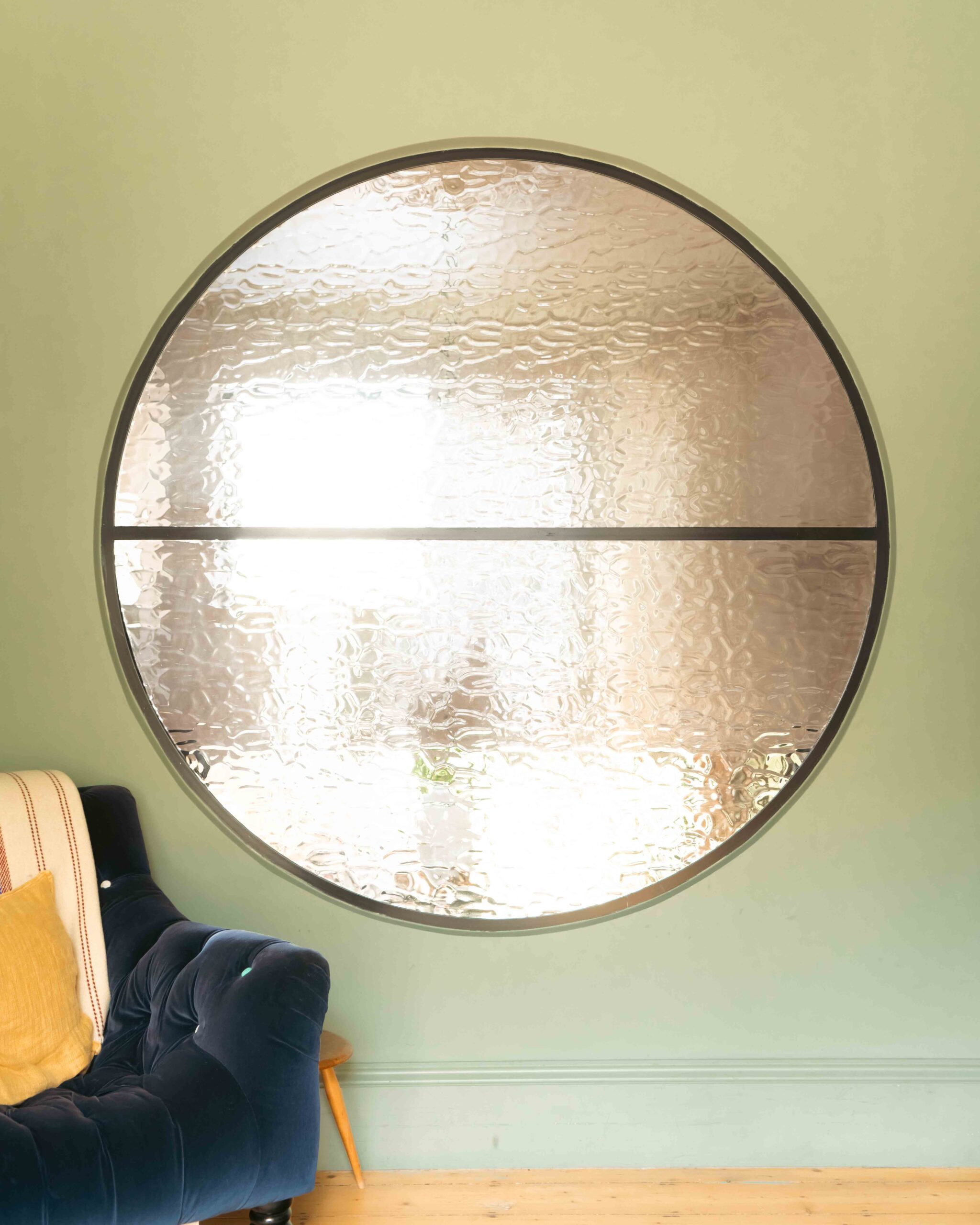 At the heart of the plan sits a dramatic, five-metre-tall dining space that acts as a transition from the original entrance hall into the new addition. A large, circular cast-glass window, framed in steel, provides a visual and spatial link between old and new, allowing light and movement to travel through the depth of the home.